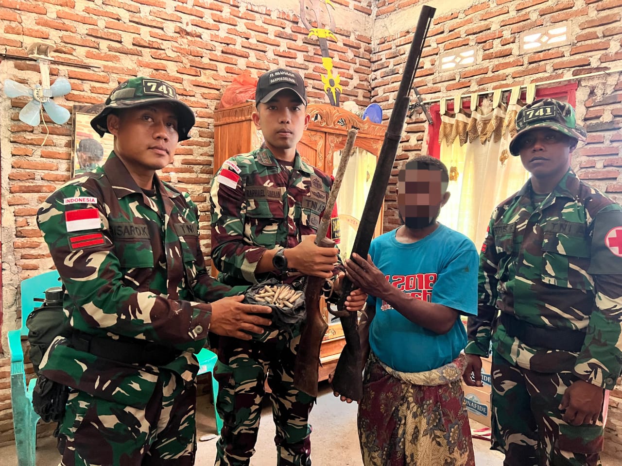 ATAMBUA, The East Indonesia – Satuan tugas (Satgas) Pengamanan Perbatasan (Pamtas) Negara RI-RDTL Sektor Timur, Yonif 741/ Garuda Nusantara (GN) Pos Delomil mendapatkan 1 Pucuk Senjata Springfield, 1 Pucuk Senjata Rakitan dan 35 Butir Munisi 5,56 mm aktif bertempat di Rumah warga Dusun Dilumil, Desa Lamaksenulu, Kecamatan Lamaknen, Kabupaten Belu, Rabu, 06 November 2024.