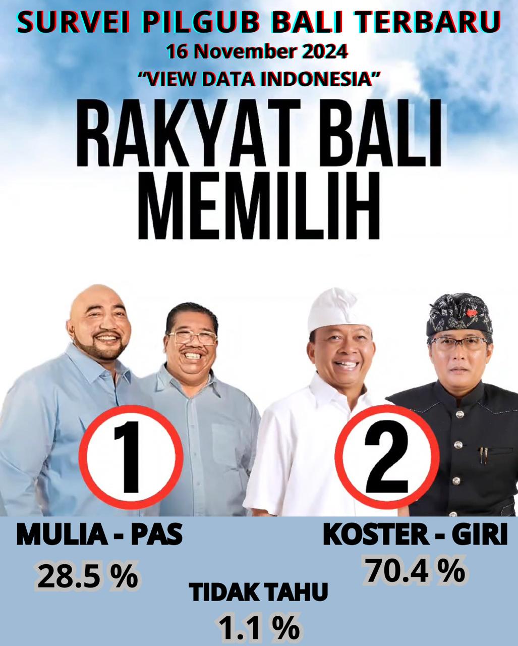 Elektabilitas Koster-Giri tercatat mencapai 70,4%, jauh melampaui pasangan Made Muliawan Arya (De Gadjah) dan Agus Sudnyana yang hanya meraih dukungan sebesar 28,5%.