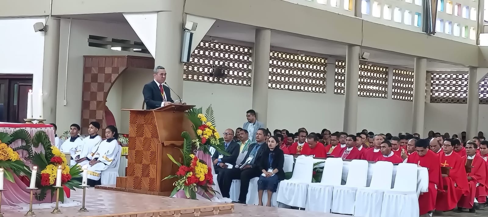 Sekda menyampaikan bahwa, Selaku Ketua Umum Panitia Pentahbisan Imam Baru Paroki Katedral Atambua, menyampaikan profesiat dan selamat berbahagia kepada 10 Imam baru bersama keluarga besar.