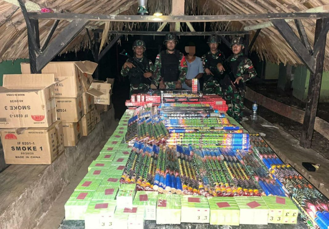 ATAMBUA, The East Indonesia – Satuan tugas (Satgas) Pengamanan Perbatasan (Pamtas) Negara RI-RDTL Sektor Timur, Yonif 741/ Garuda Nusantara (GN) Pos Nunura berhasil gagalkan penyelundupan berupa 32 Dus Besar Petasan di arah jalan Kp 12 jalan ilegal Pos Nunura Dusun Waikrame, Desa Tohe, kecamatan Raihat, Kabupaten Belu, Rabu, 4 Desember 2024.