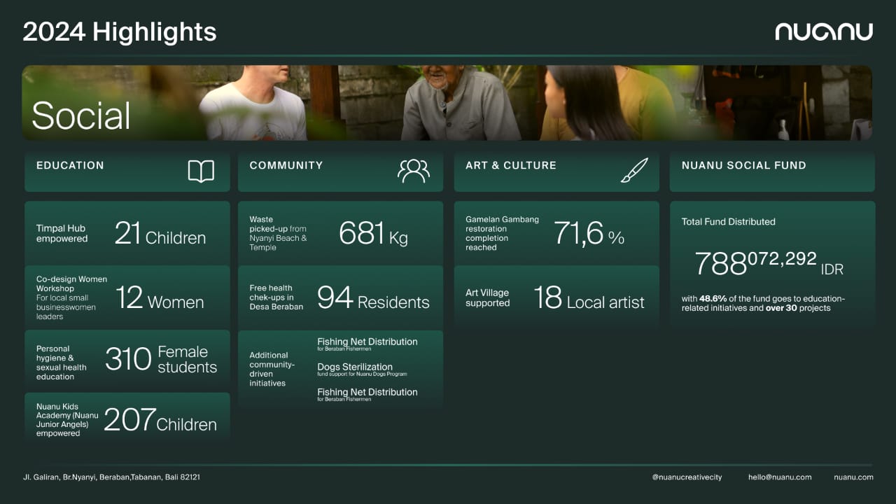 Nuanu tidak hanya fokus pada komitmen lingkungan, tetapi juga telah memberikan dampak sosial yang positif bagi masyarakat sekitar. Melalui Nuanu Social Fund (NSF), sejak Februari 2024, kota kreatif ini telah menyalurkan lebih dari Rp788,072,292 untuk mendukung masyarakat lokal. Sebagian besar dana, sekitar 48,6%, digunakan untuk inisiatif pendidikan yang mencakup lebih dari 30 proyek NSF.