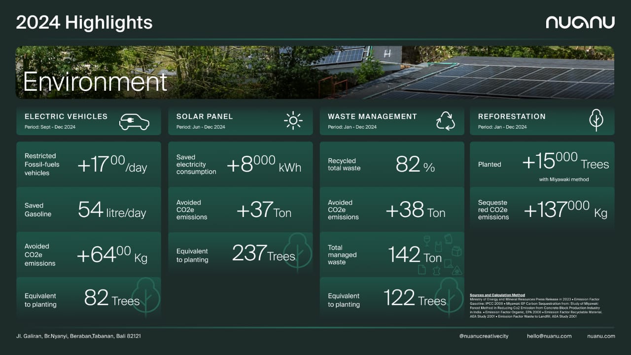 Sejak tahun 2024, Nuanu telah meluncurkan terobosan strategis untuk meminimalisir jejak karbon yang bermanfaat secara jangka panjang bagi lingkungan dan komunitas. Mulai dari penggunaan energi alternatif, sistem pengelolaan limbah, sampai mengadopsi metode penghijauan yang efektif, Nuanu telah menciptakan kerangka untuk kota berkelanjutan secara global. Inilah beberapa pencapaian utama di bidang lingkungan meliputi:
