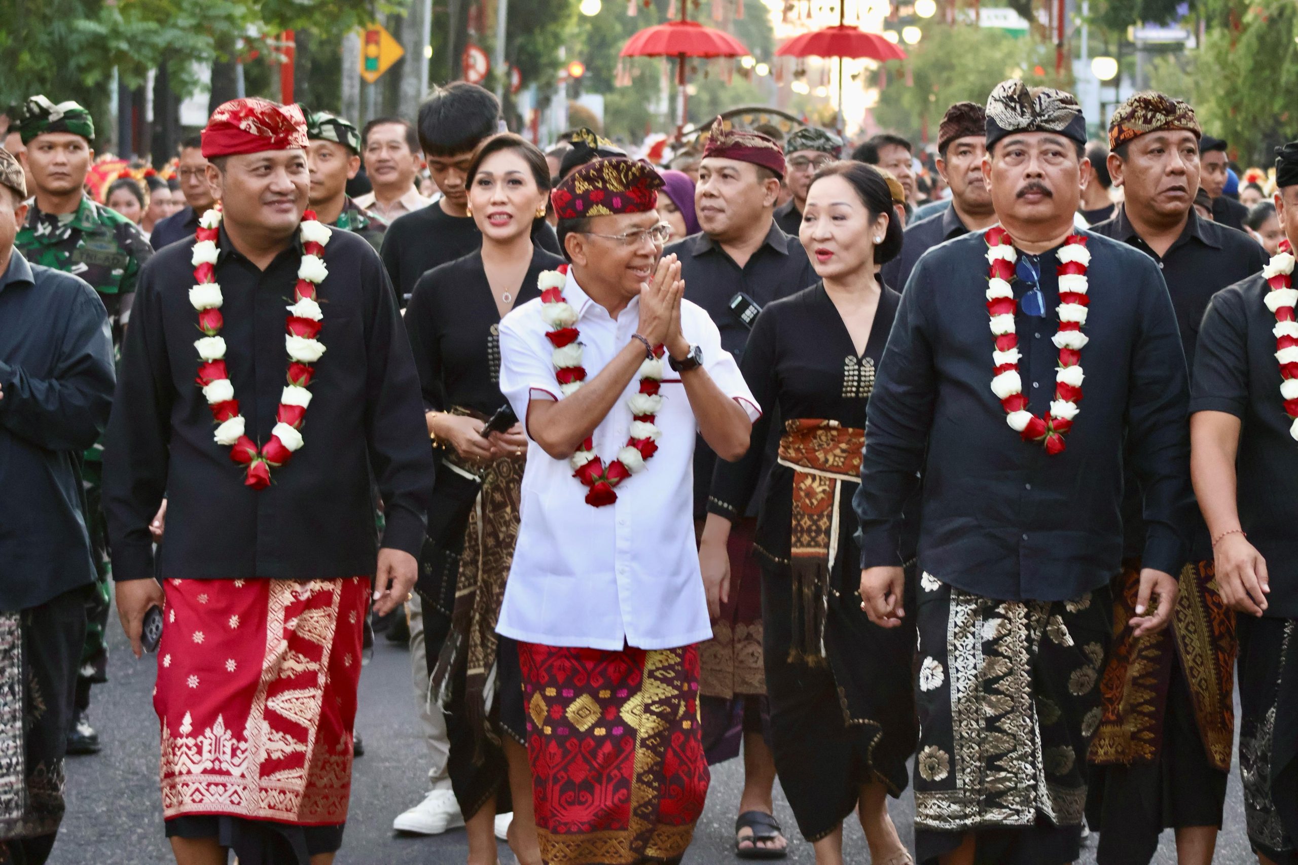 Gubernur Koster tampak antusias berjalan diiringi keindahan dan uniknya budaya Gianyar.