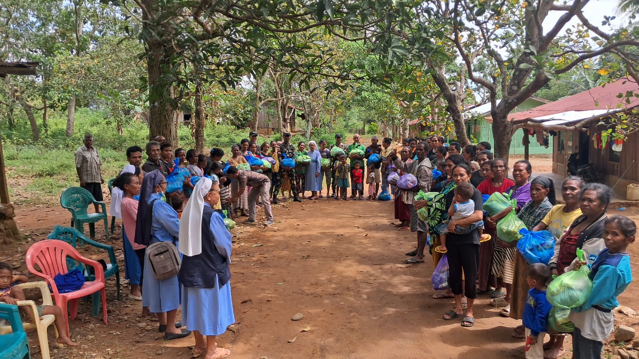 ATAMBUA, The East Indonesia – Satuan tugas (Satgas) Pengamanan Perbatasan (Pamtas) Negara RI-RDTL Sektor Timur, Yonif 741/ Garuda Nusantara (GN) Pos Mahen bersinergi dengan para suster di Kapela Mgr Gabriel Manek SVD Lahurus membagi-bagikan sembako kepada masyarakat di daerah Perbatasan Negara RI-RDTL.