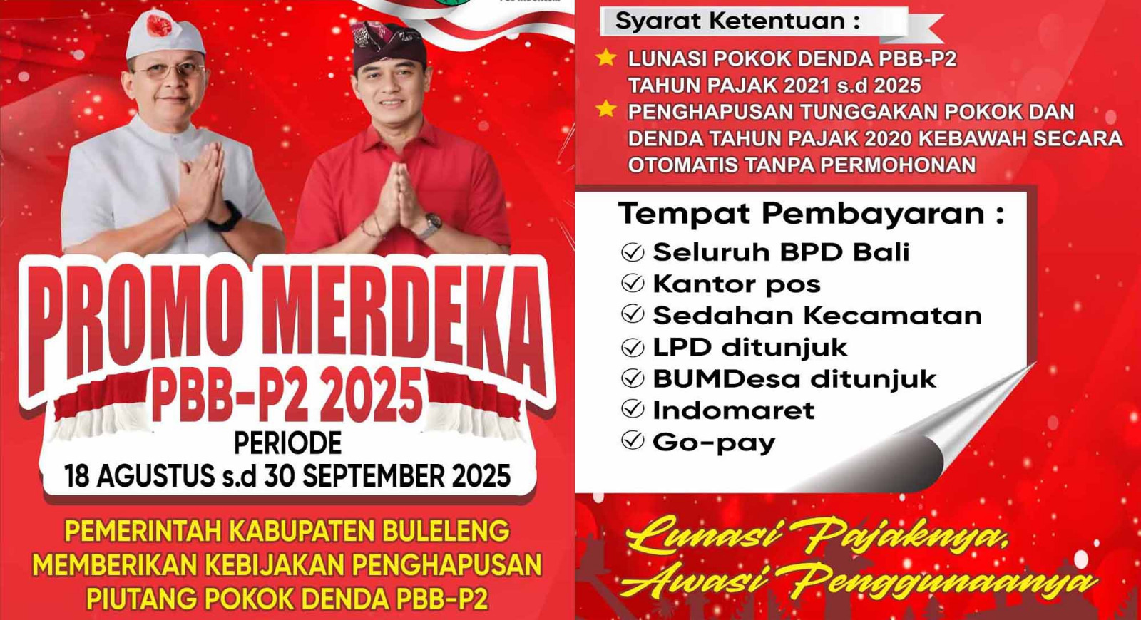 SINGARAJA, The East Indonesia – Pemerintah Kabupaten (Pemkab) Buleleng melalui Badan Pengelolaan Keuangan dan Pendapatan Daerah (BPKPD) Kabupaten Buleleng gulirkan Promo Merdeka PBB-P2 2025 periode 18 Agustus – 30 September 2025. Selain tanpa permohonan, kebijakan yang dilakukan berdasarkan Perbup No. 17 tahun 2025 tentang Pemberian Pembebasan Piutang Pokok Pajak Bumi dan Bangunan Perkotaan serta Perdesaan (PBB-P2) juga digulirkan dengan persyaratan sangat mudah.