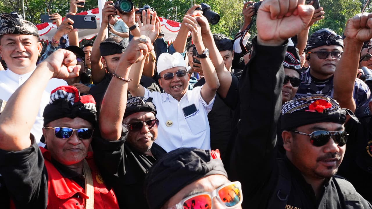 Gubernur Bali didampingi jajaran Forkopimda hadir langsung di tengah tengah belasan ribu pecalang Bali dari Kabupaten/kota se Bali seraya memekikkan yel-yel mendukung dan menyemangati pecalang Bali untuk bersama -sama menjaga Gumi Bali aman, damai dan tentram.