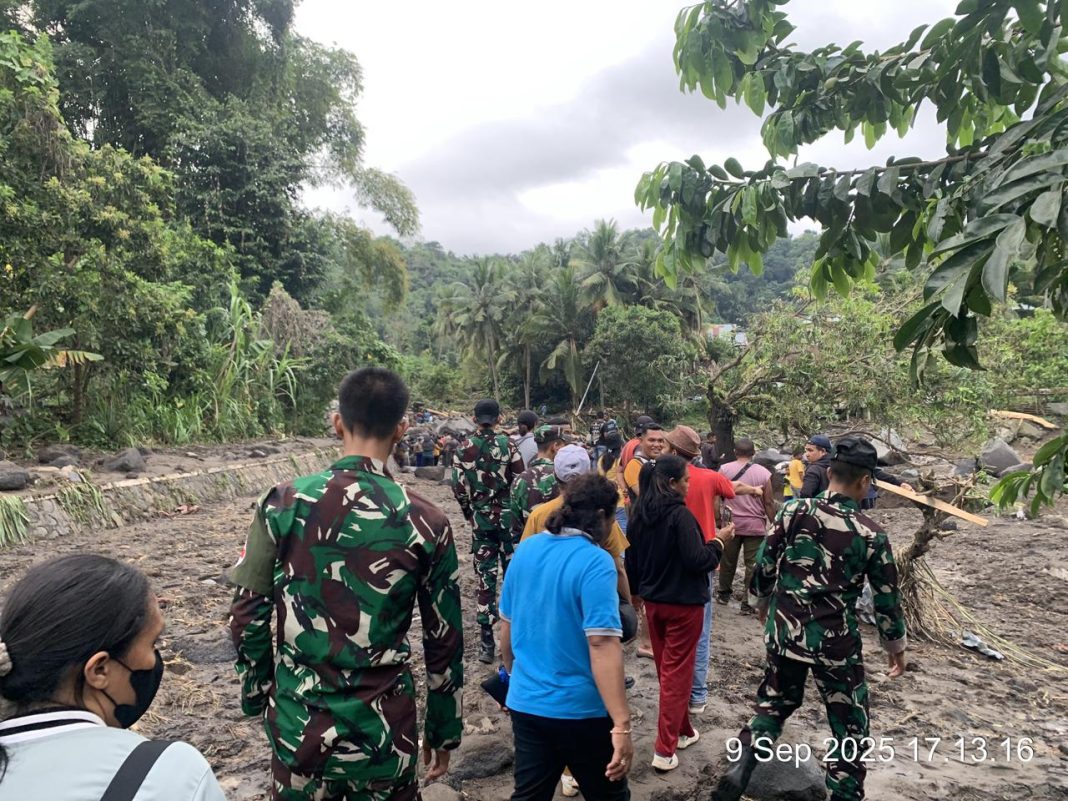Masyarakat bersama Personil Yonif TP 834/WM segera bergerak melakukan peninjauan di lokasi yang terdampak. Warga terlihat bergotong royong membersihkan material banjir sambil memastikan tidak ada korban jiwa yang tertinggal di area aliran sungai. Suasana haru dan cemas menyelimuti warga, namun semangat kebersamaan membuat proses penanganan berjalan lebih cepat.