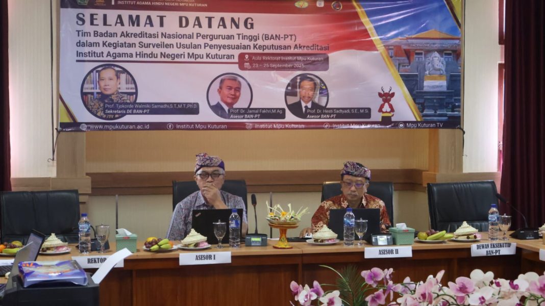 SINGARAJA, The East Indonesia – Institut Agama Hindu Negeri Mpu Kuturan menyelenggarakan kegiatan Surveilen Usulan Penyesuaian Keputusan Akreditasi di Aula Rektorat IAHN Mpu Kuturan, Rabu (24/09). Kegiatan ini merupakan bagian dari upaya berkelanjutan institusi untuk menjaga dan meningkatkan mutu layanan akademik sesuai standar akreditasi nasional.