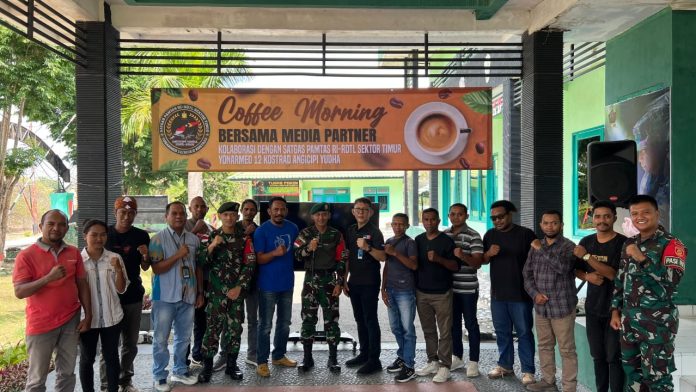 ATAMBUA, The East Indonesia – Satgas Pamtas RI-RDTL Sektor Timur Yonarmed 12 Kostrad Angicipi Yudha menggelar acara coffe morning bersama media partner.