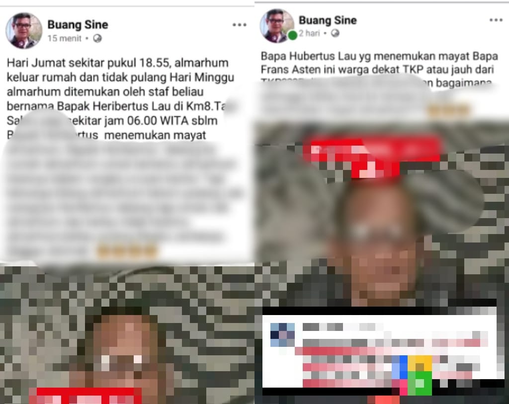 ”Sebenarnya yang datang pagi itu bukan Bapak Hubertus Lau, tetapi menurut pemberitahuan keluarga korban, orang yang datang itu adalah salah satu pegawai yang juga ikut menemukan jenazah almarhum,” tulis Buang Sine dalam unggahan klarifikasinya.