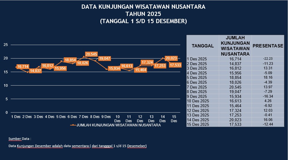 Data tersebut menjelaskan hingga 22 Desember 2025, kunjungan wisatawan mancanegara (wisman) terus meningkat menuju akhir tahun 2025. Tercatat sebanyak 6,8 juta wisman berkunjung. Sementara kunjungan wisatawan domestik atau wisatawan nusantara sebanyak 9,1 juta orang.