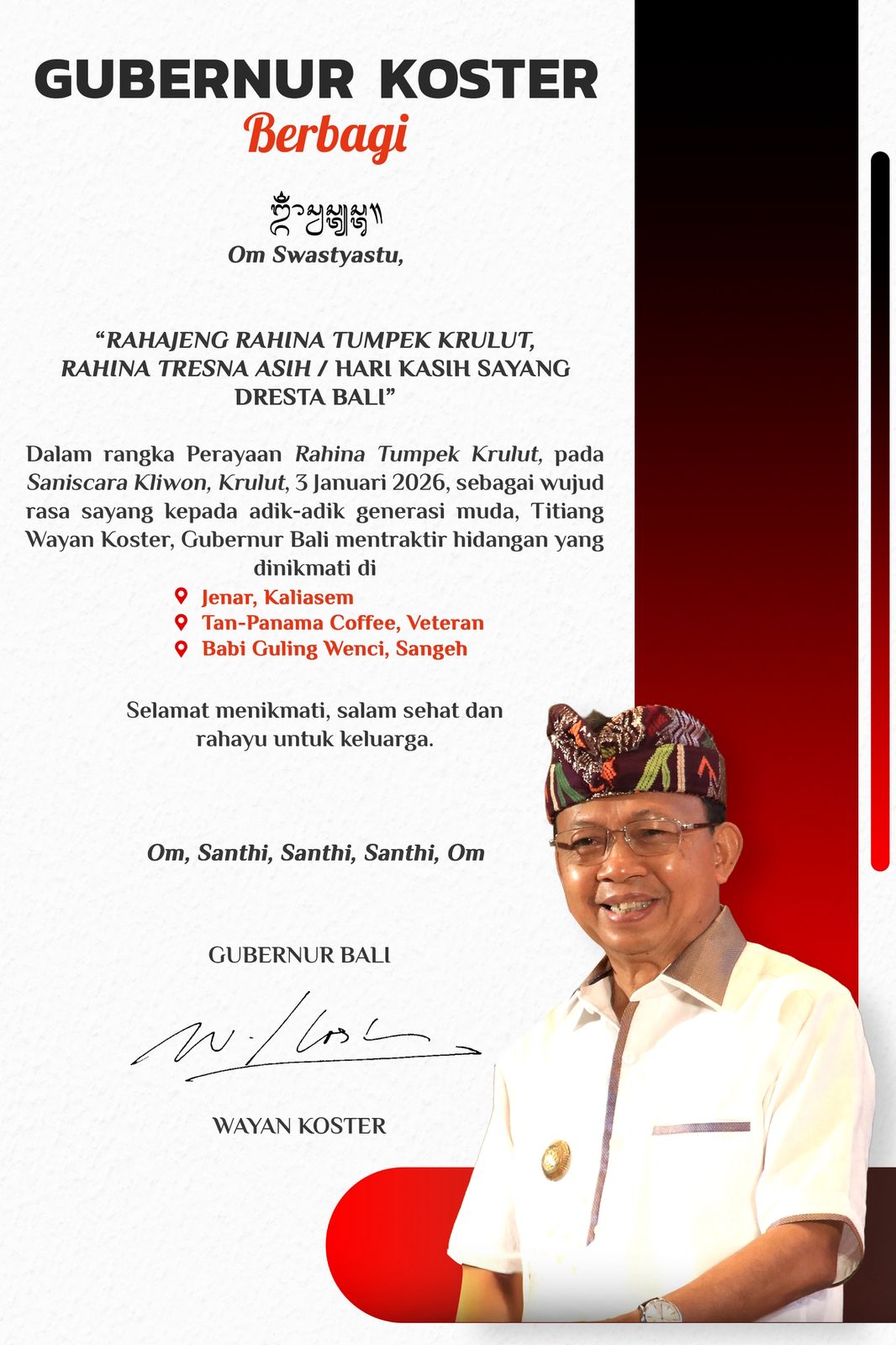 Dalam rangka Perayaan Rahina Tumpek Krulut, pada Saniscara Kliwon, Krulut, 3 Januari 2026, sebagai wujud rasa sayang kepada adik-adik generasi muda, Titiang Wayan Koster, Gubernur Bali mentraktir hidangan yang