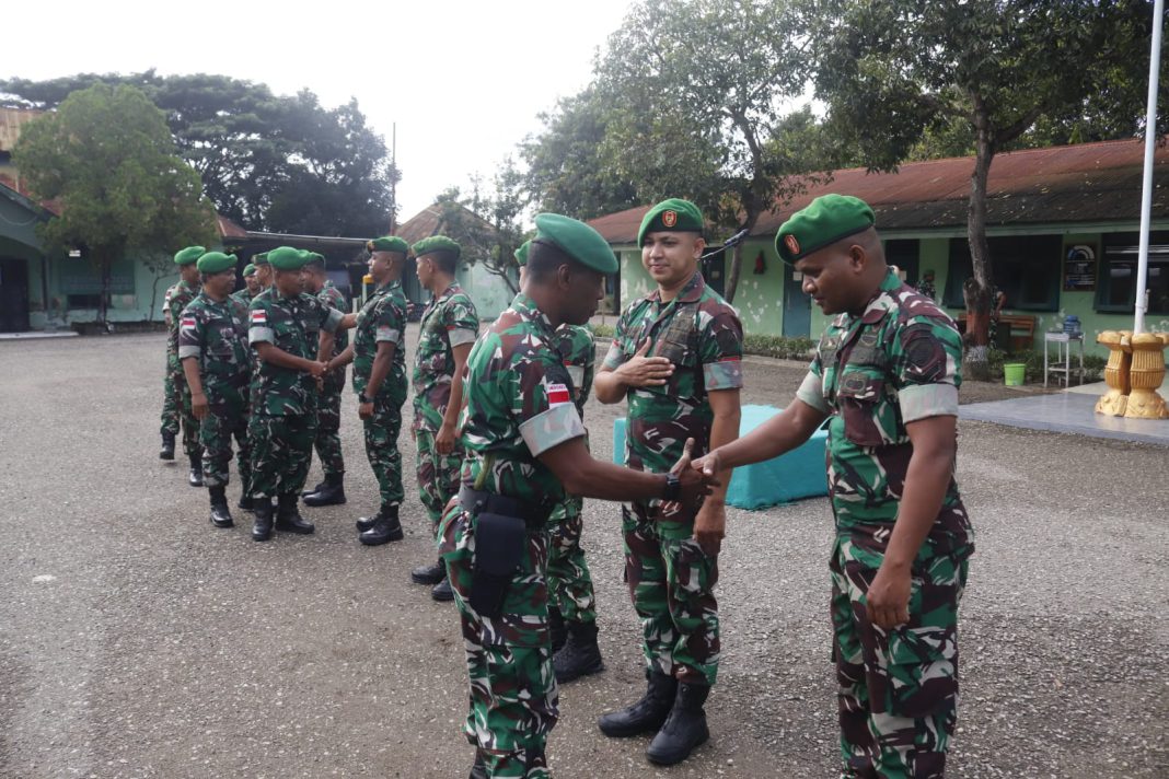ATAMBUA, The East Indonesia – Kasdim 1605/Belu, Mayor Arm Paulus, memimpin apel pelepasan tujuh orang anggota Kodim 1605/Belu yang akan melaksanakan tugas Bantuan Personil (BP) Satgas Pamtas RI-PNG Mobile Yonif 900/SWB.