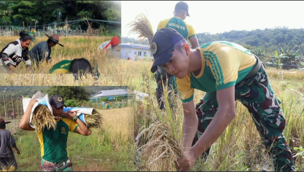 ATAMBUA, The East Indonesia – Personel Makosatgas Yonarmed 12 Kostrad bahu-membahu bersama warga membantu panen padi di sawah milik masyarakat setempat yang berada di Kelurahan Umanen, Kecamatan Atambua Barat, Kabupaten Belu.